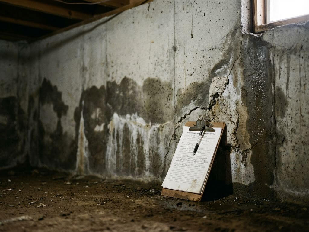Doorsnede van huisfundament met waterschade en vochtplekken, vastgoedtaxatieklembord tegen beschadigde betonnen muur