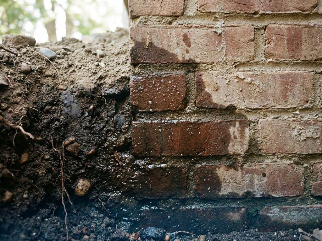 Doorsnede bakstenen funderingsmuur met vocht dat omhoog sijpelt uit verzadigde grond, waterdruppels op metselwerk zichtbaar