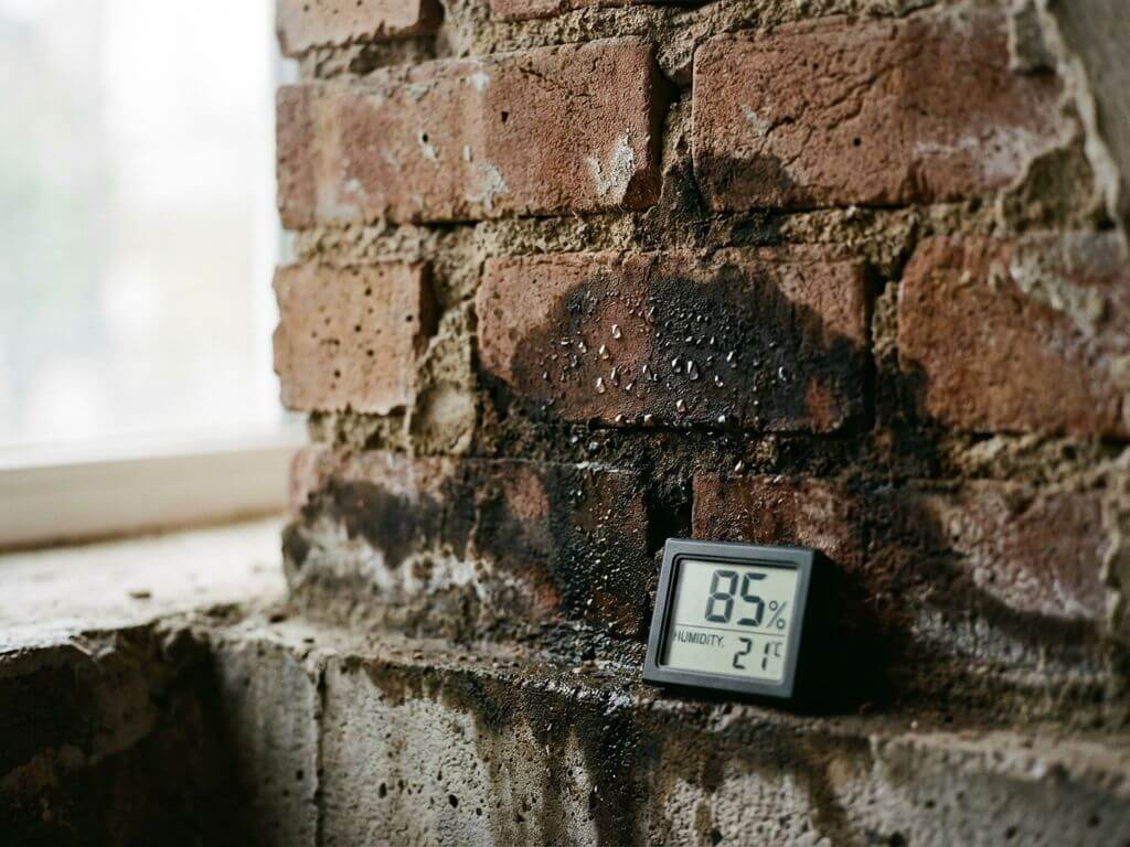 Bakstenen muur met vochtige vlekken en waterschade vanaf fundering, digitale hygrometer toont luchtvochtigheid
