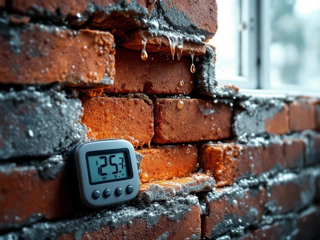 Bakstenen muur met vochtschade, waterdruppels en hygrometer die luchtvochtigheid meet bij natuurlijk licht