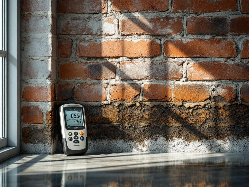 Doorsnede bakstenen muur met vochtschade, waterdruppels en donkere vlekken, digitale vochtmeter toont metingen