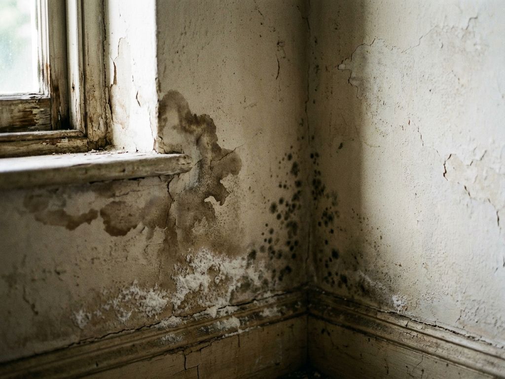 Vochtige muurhoek met watervlekken, zoutkristallen en schimmelplekken bij raamkozijn in natuurlijk daglicht