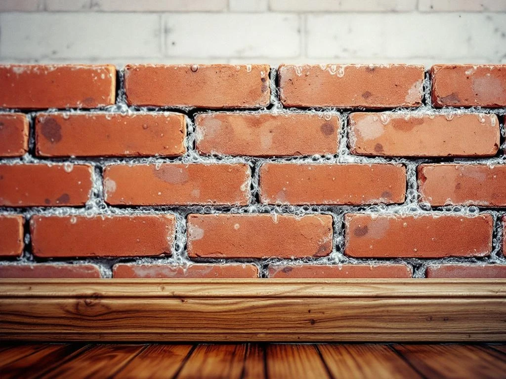 Doorsnede van bakstenen muur met opstijgend vocht, donkere vlekken en beschadigde houten plint door wateropname