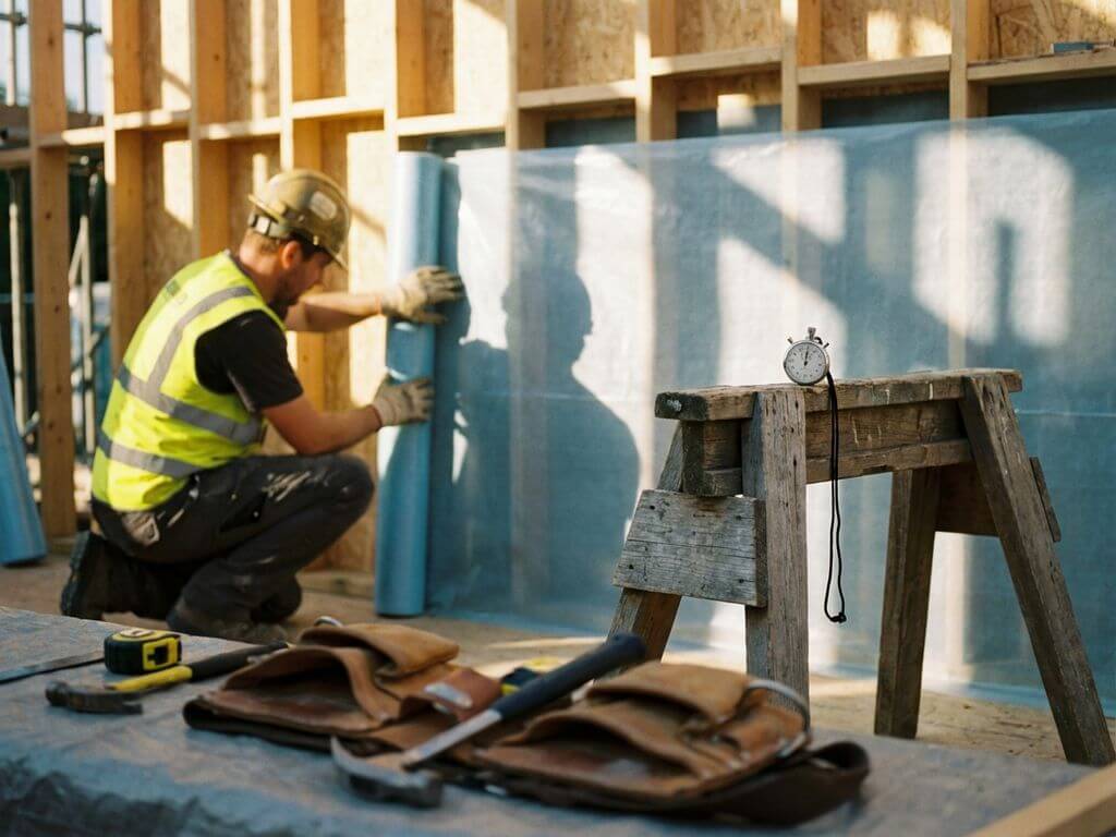 Bouwvakker in veiligheidskledij installeert vochtbarrière op houten frame met gereedschap in voorgrond