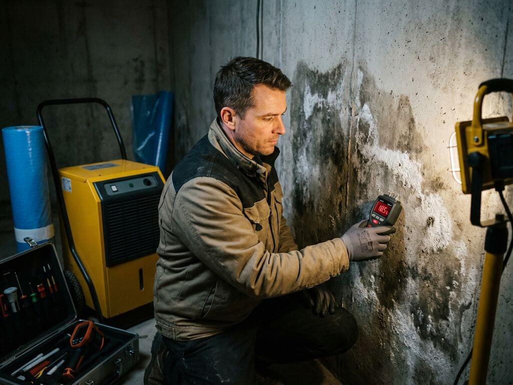Vochtspecialist meet met digitale vochtmeter vochtige kelder muur, professionele gereedschappen zichtbaar op achtergrond