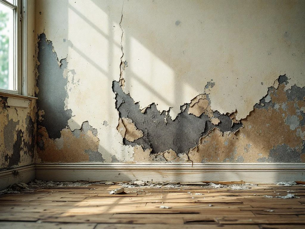 Waterschade aan binnenmuur met donkere vlekken, schimmel, loslating behang en vervormde houten vloerplanken