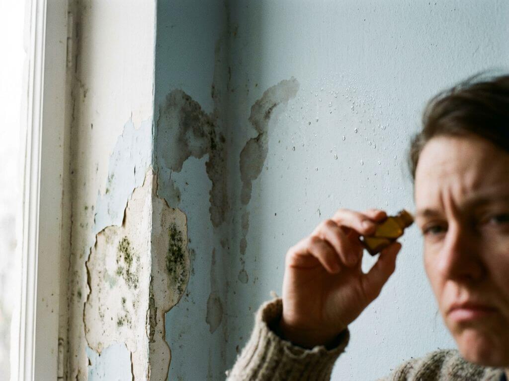 Waterschade aan binnenmuur met schimmelplekken en vochtdruppels, persoon ruikt aan glazen buisje voor geurdetectie